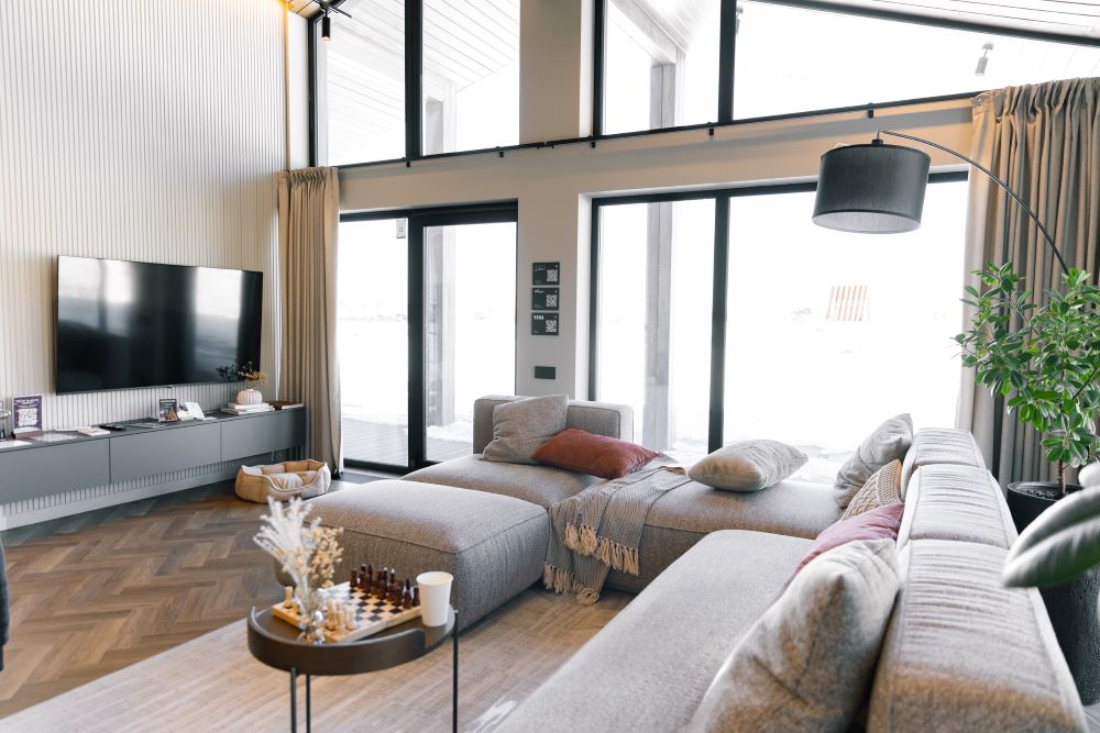В активной зоне кварцевый ламинат уложен единым полотном, он подчёркивает целостность пространства и создает ощущение порядка. Это современный дом с качественными материалами, где комфорт чувствуется сразу — без лишних объяснений.