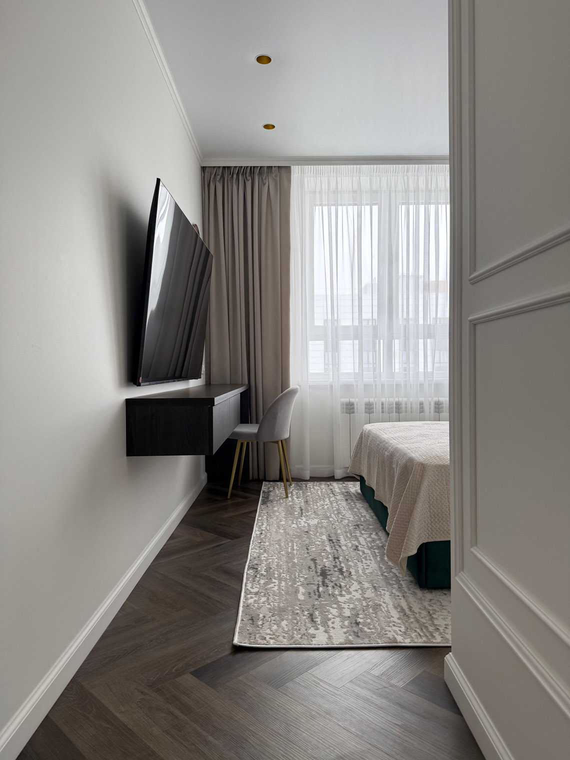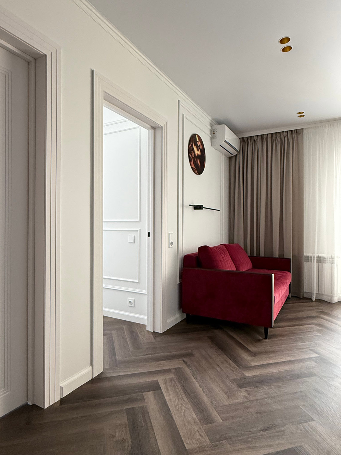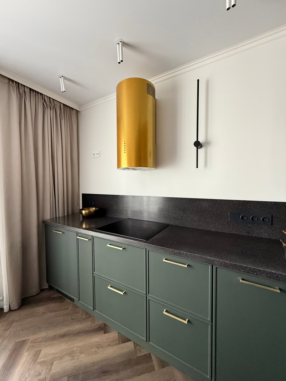 В основе этого интерьера — смелый контраст: белоснежные стены + темная мебель. То, чего многие избегают, здесь выглядит безупречно. Кварцевый ламинат в укладке мелкой «ёлочкой» добавил пространству графичности и поддержал насыщенную цветовую палитру.